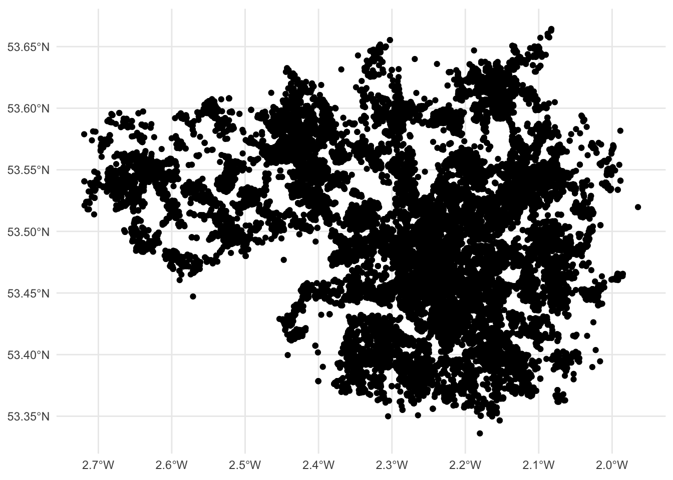 Great, we now have an outline of the LSOAs in Manchester. Notice how the shape is different to that of the points in our crime data. Why do you think this is? Discuss your thoughts with your neighbour. Or one of the teaching team. Don’t be shy!