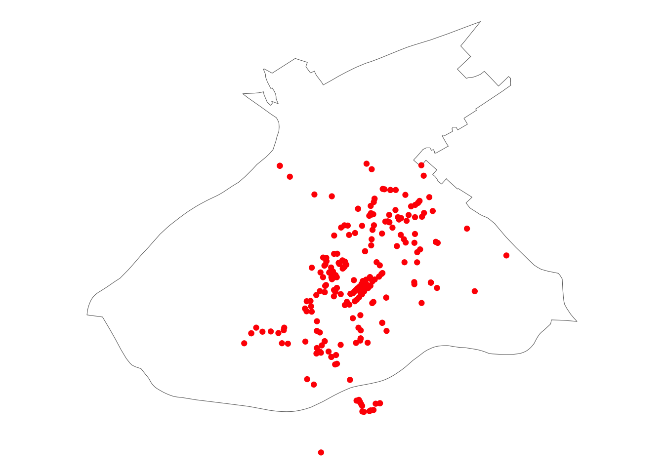 You can see now that any points that were outside the boundary are no longer in our dataset. COOL, we have successfully performed our first spatial operation, we managed to subset our points data set to include only those points which are inside the polgon for city centre. See how this was much easier, and more reliable than the hacky workaround using pattern matching? Yay!