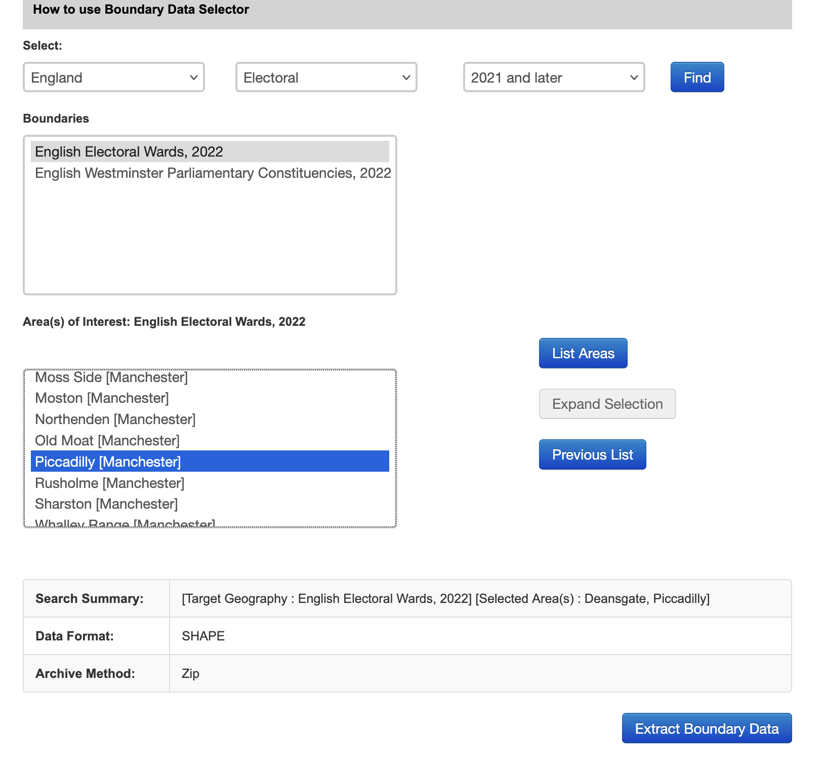 To get these data we will go back to the ONS Boundary Data Selector tool which we used in week 2. Follow the steps for selecting your desired geography and areas again, but this time select England > North West > Manchester, and choose Deansgate and Piccadilly: