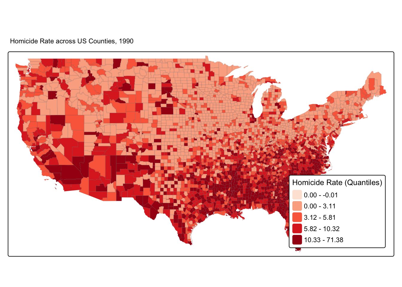 tm_title("Homicide Rate across US Counties, 1990", size = 0.7) ## old-style crs object detected; please recreate object with a recent sf::st_crs()