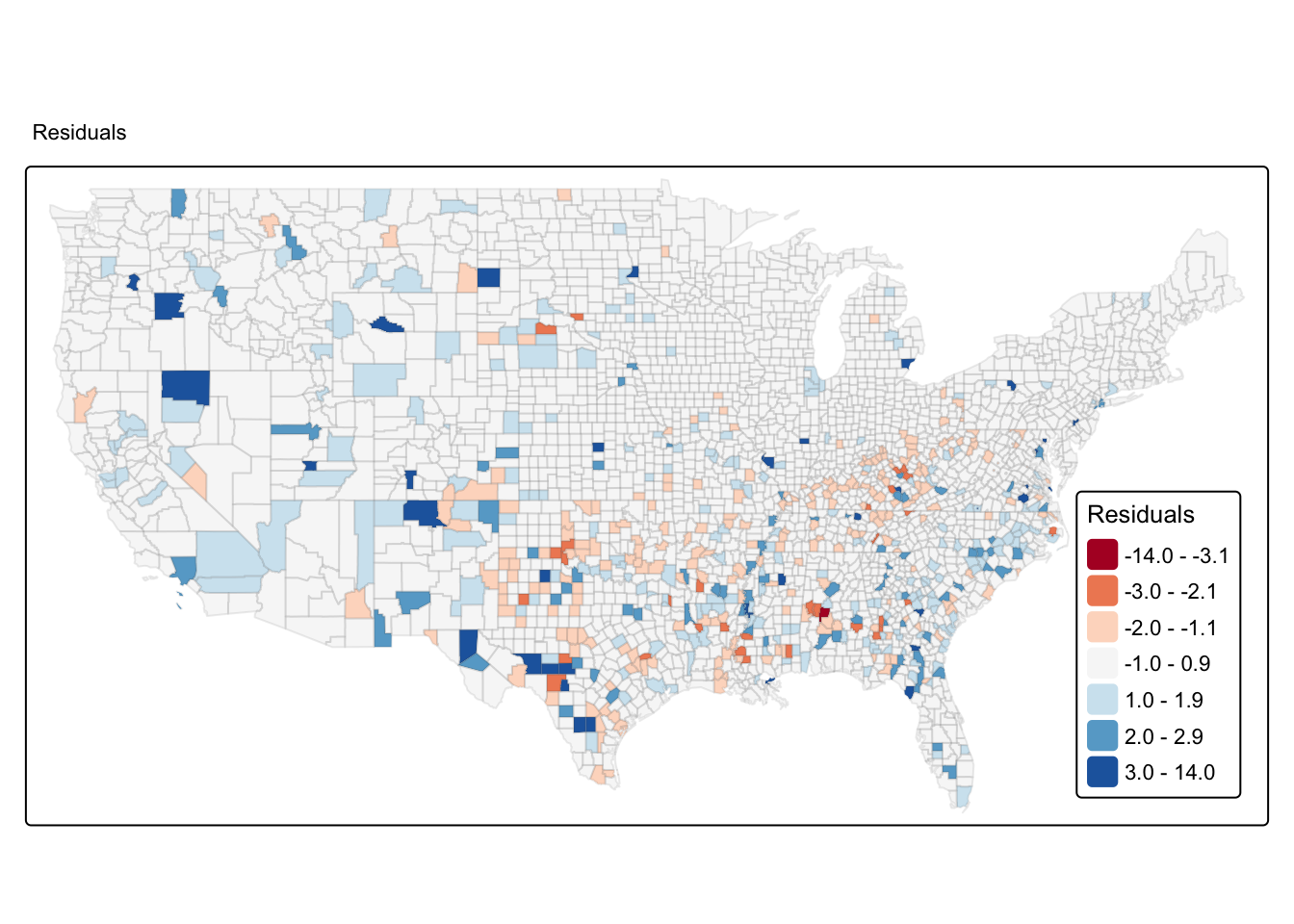 Notice the spatial patterning of areas of over-prediction (negative residuals, or blue tones) and under-prediction (positive residuals, or brown tones). This visual inspection of the residuals is telling you that spatial autocorrelation may be present here. This, however, would require a more formal test.