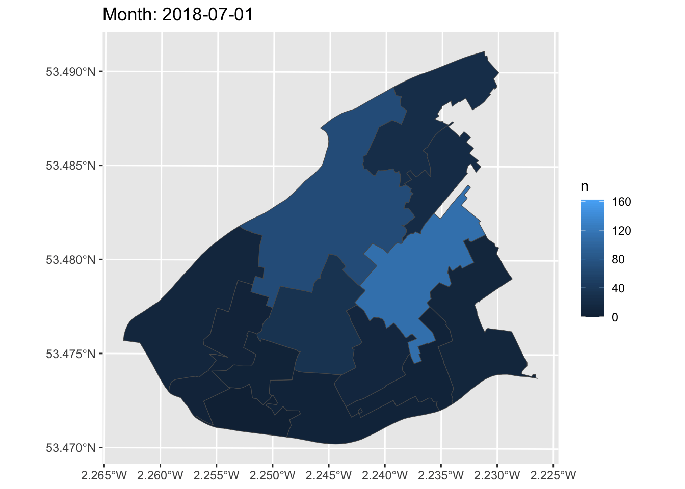 Now, we can create a simple static plot, the way we already know how. Let’s plot the number of ASB incidents per LSOA, and save this in an object called anim:
