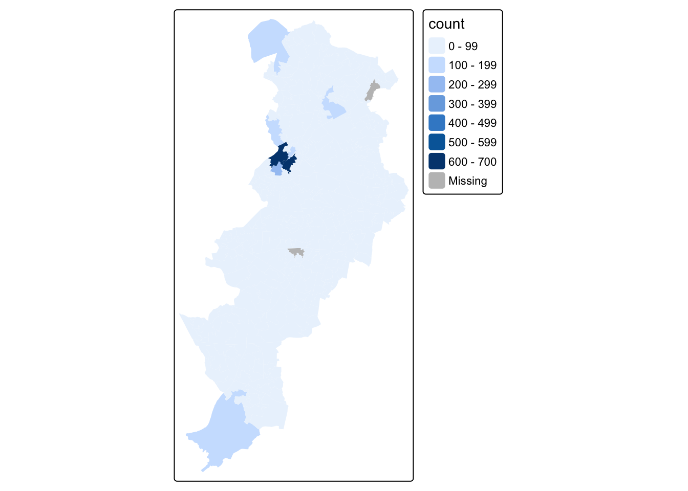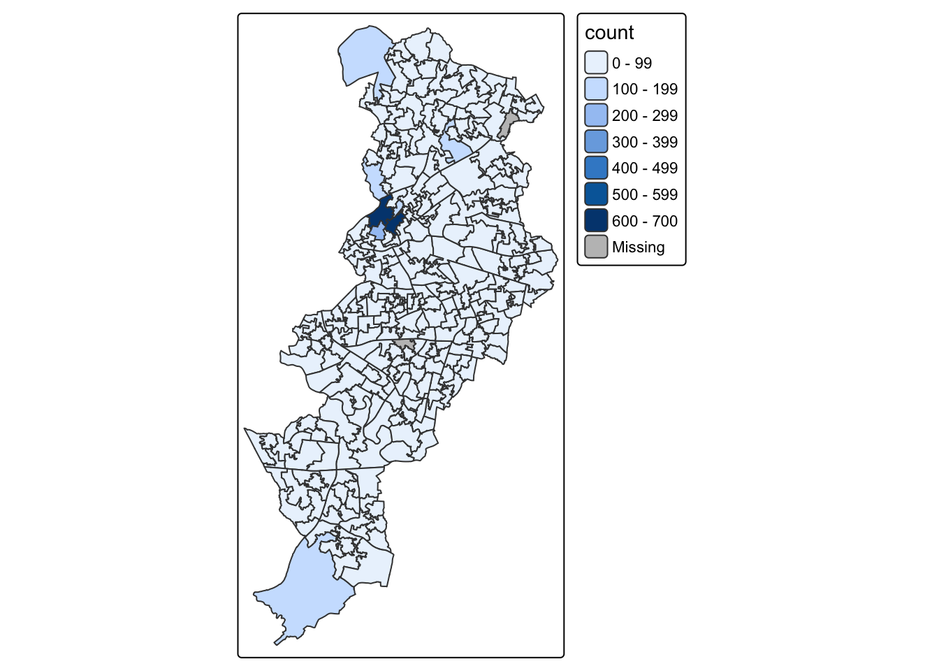 Notice as well that the legend in this map is (a) not very informative and (b) located in a place that is less than optimal, since it covers part of the map. We can add a title within the tm_title() to clarify what count is and we can use the tm_legend() function to control the appearance of the legend. This later function tm_legend() allows you to think about many of the more general cosmetics of the map.
