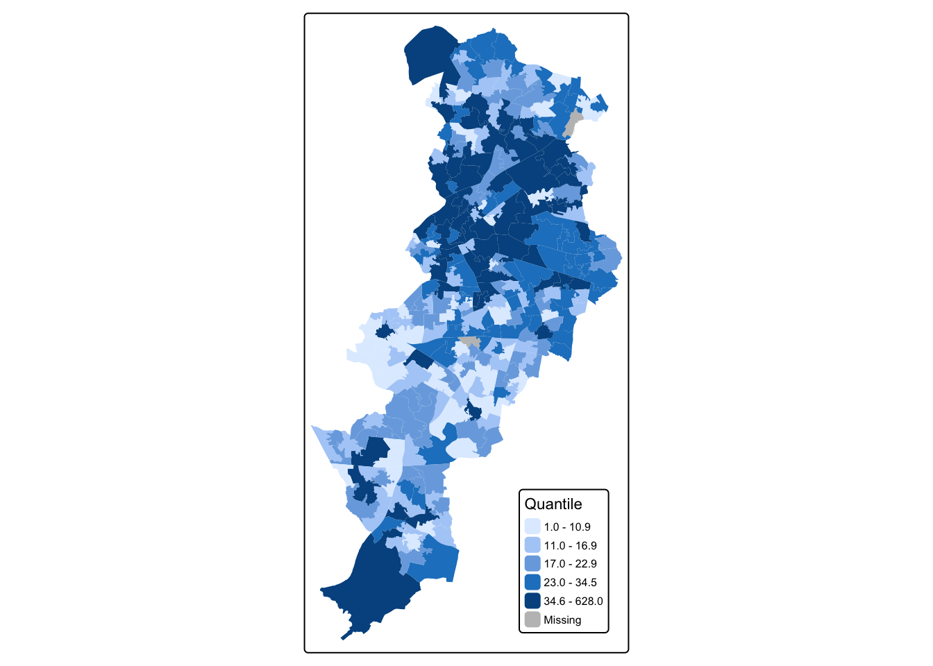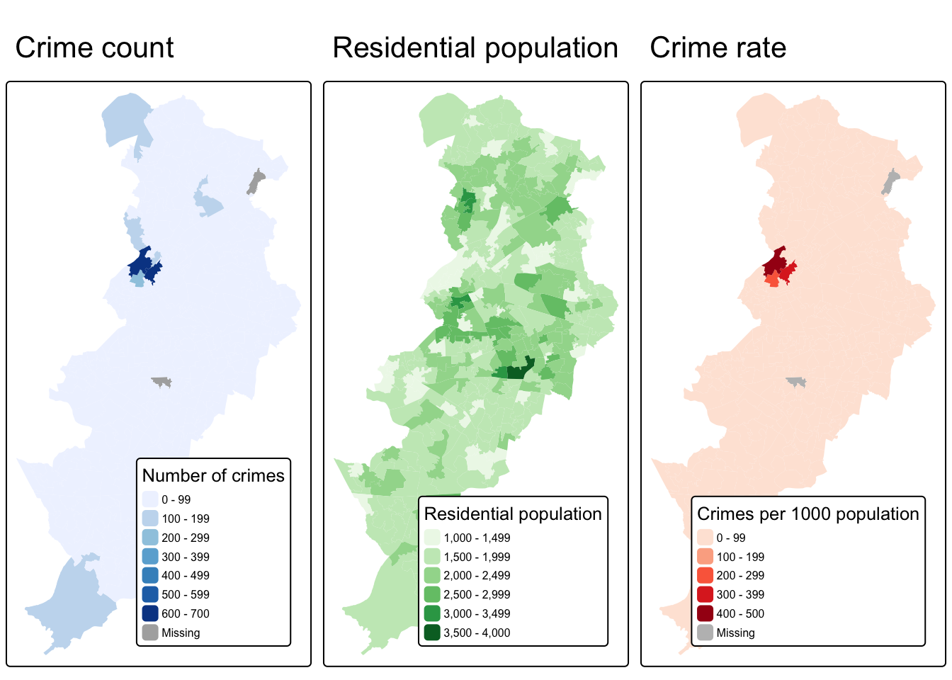 In specific to crime mapping, there is an ongoing issue of the denominators dilemma which has been cropping up in your reading. This is concerned with choosing the most appropriate measure for calculating crime rates. The best measure is one which captures opportunities. You read about some approaches to capturing ambient population for example to estimate risk for on-street crimes. Whatever denominator you choose, you will usually want to make a case as to why that is the best representation of the opportunities for the crime type you’re interested in.