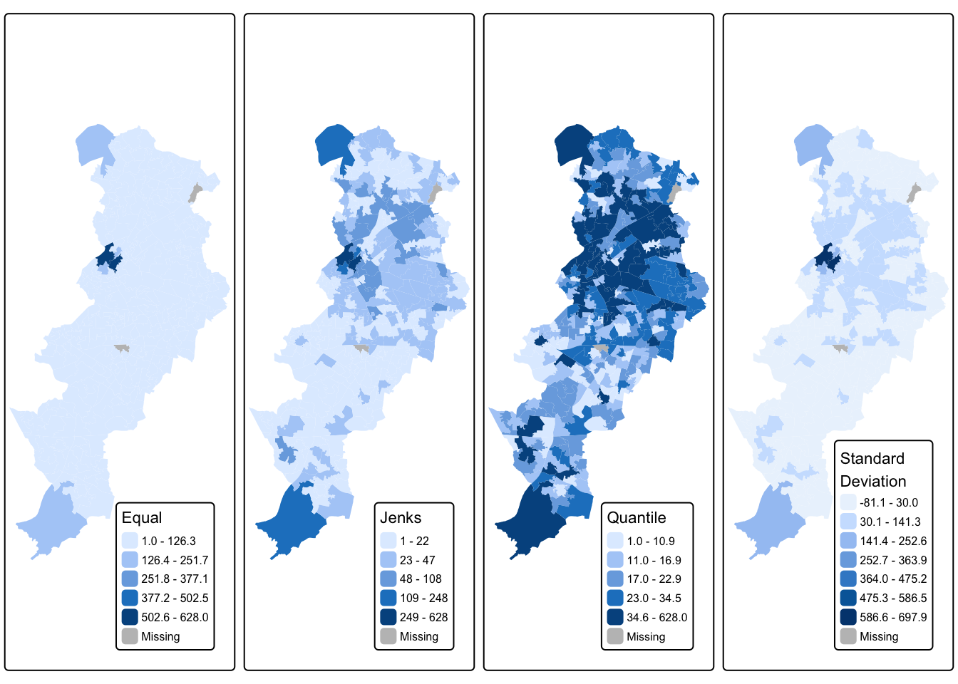 Let’s make four maps, each one using a different classification method: Equal interval, Quantile, Natural breaks (Jenks), and Standard Deviation.