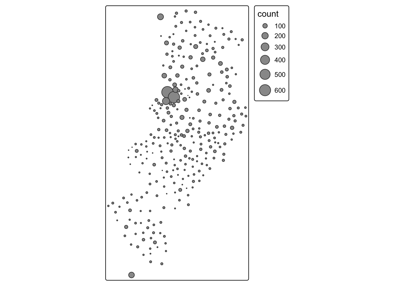 Some of the literature on thematic cartography highlights how counts, like the ones above, are best represented using graduated symbols rather than choropleth maps (using colour, as we did above). So let’s try to go for a more appropriate representation. In tmap you can use tm_symbols for this. We will also use tm_borders to provide some context.