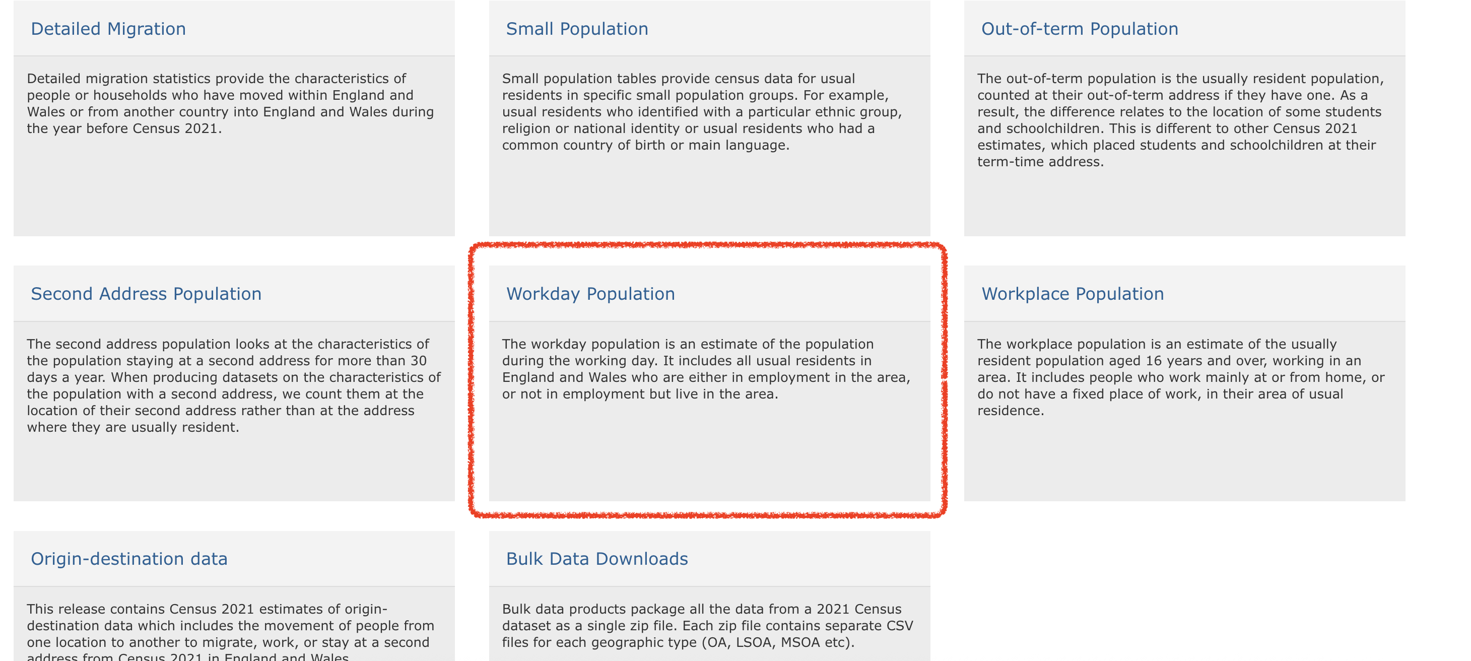 So we want to go to the nomis data portal and select the 2021 census data. Specifically we want residential and workday populations. To download these you have to select two different boxes. First, scroll down to the Workday Population box and click on that.