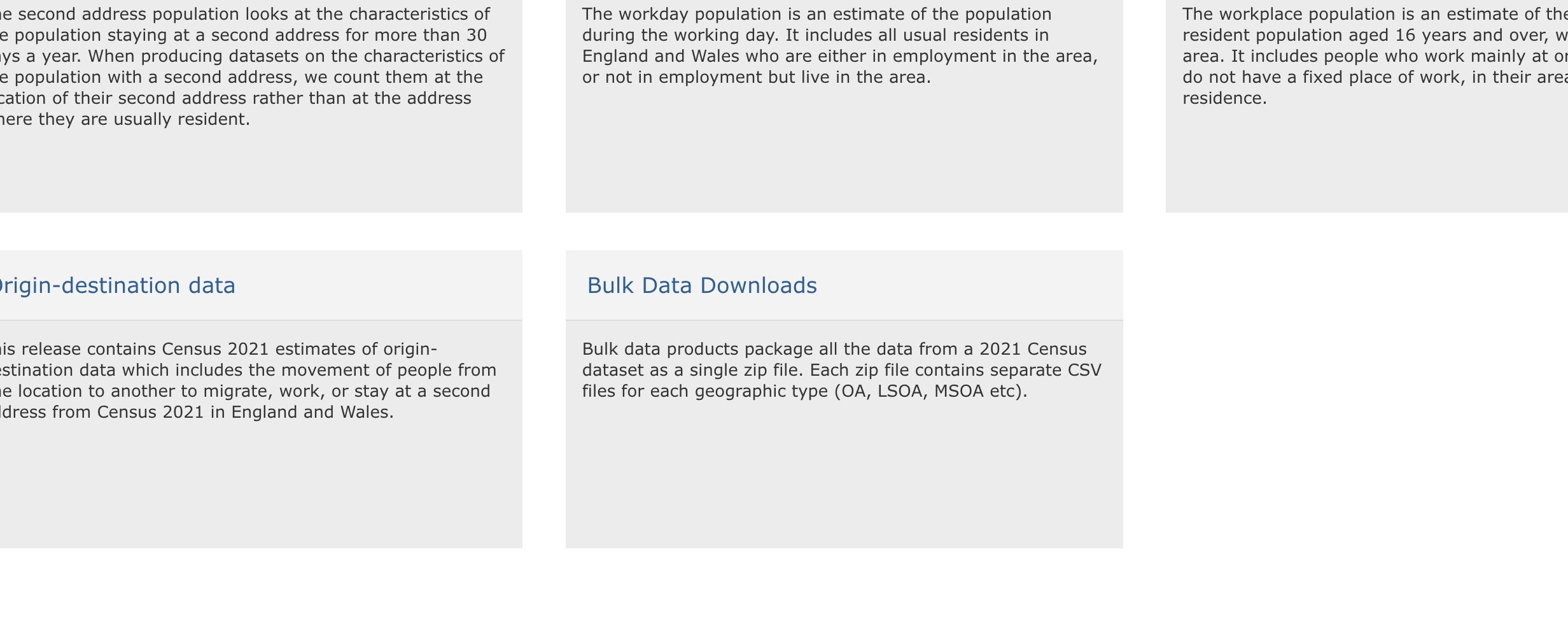 Specifically we want to find workday population () and residential population () to be able to use the two different denominators to make comparisons. Do note that the Census data are from 2021, at a time when COVID-19 related restrictions were in place, so the workday population figures may not be representative of a typical year. The next census is not until 2031, but the ONS do publish updated population estimates over time so you may want to explore those for more up to date figures. However, for the purposes of this course, we will be working with the census data.