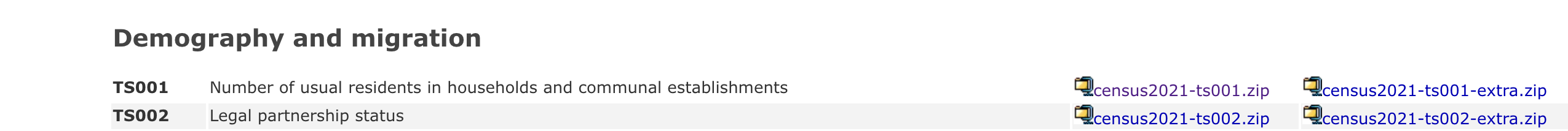 This will take you to https://www.nomisweb.co.uk/sources/census_2021_bulk where you can download the first file there ‘TS001: Number of usual residents in households and communal establishments’: