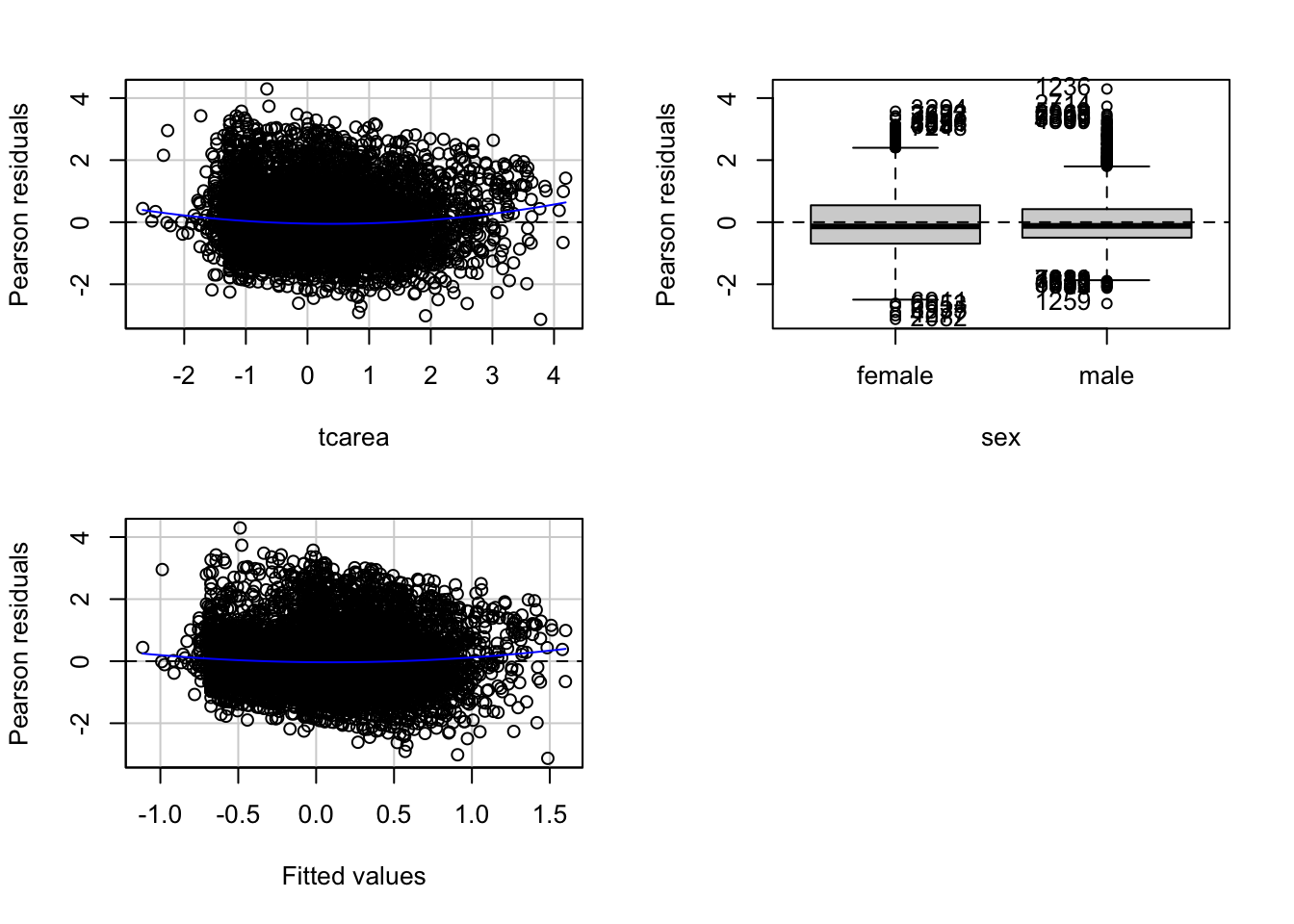 The most important of this is the last one, the scatterplot of the Pearson residuals versus the fitted values. In these plots one has to pay particular attention to nonlinear trends, trends in variations across the graph, but also isolated points. Ideally a plot of the residuals should show that: