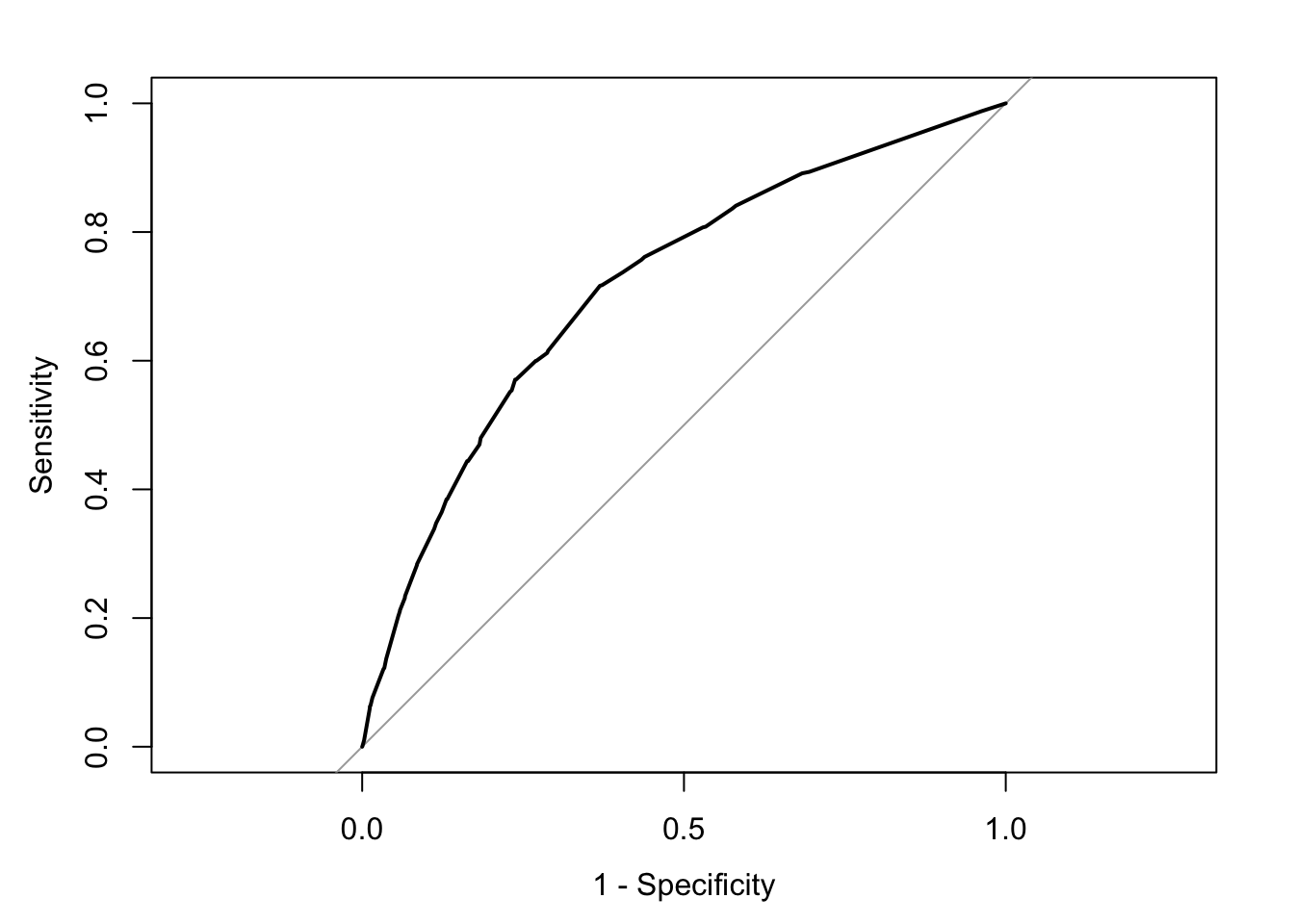 We can use the pROC package for this. We start by creating an object that contains the relevant information with the roc() function from the pROC package.