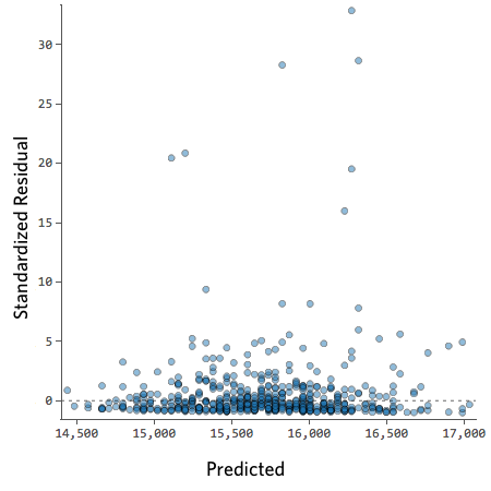 On the other hand, if your plot isn’t evenly distributed vertically, or they have an outlier, or they have a clear shape to them, that indicates you can detect a clear pattern or trend in your residuals. In this case, then your model has room for improvement.